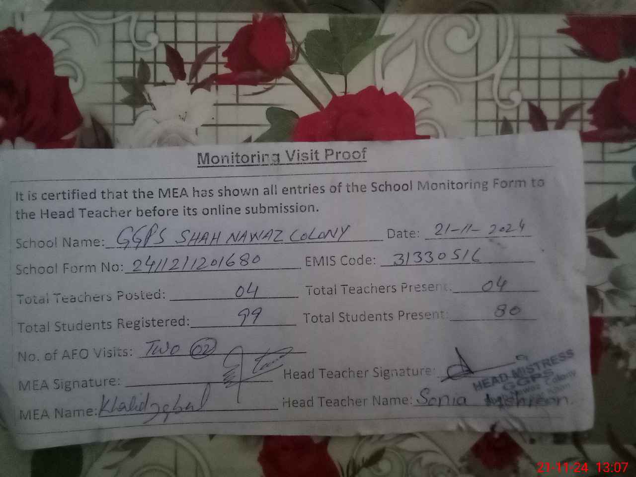 | Remarks (Use Separate Page if Required): Class verification is not updated on mea tab as per sis and two classes are sitting under shed and teachers attendance updated on 21 11 2024 | |||||