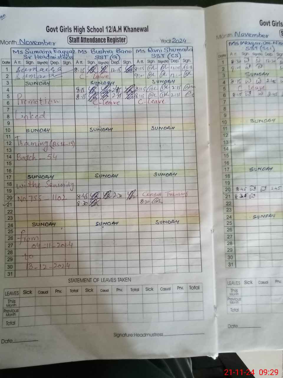 | 31**** | Su**** Fa**** | Sr. Headmaster | Regular | 0 | 0 | 0 | 0 | 0 | 0 | 0 | 0 | 0 | On Training |