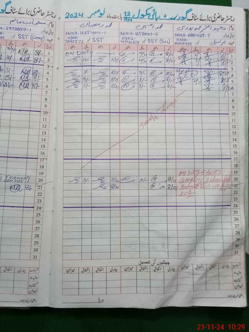 | Remarks (Use Separate Page if Required): PST M Ayaz CNIC 3610426501193 is absent since Apr 24 and EST Sci Syed Fazal Ur Rehman CNIC 3610366632857 is also absent since Dec 23 | |||||