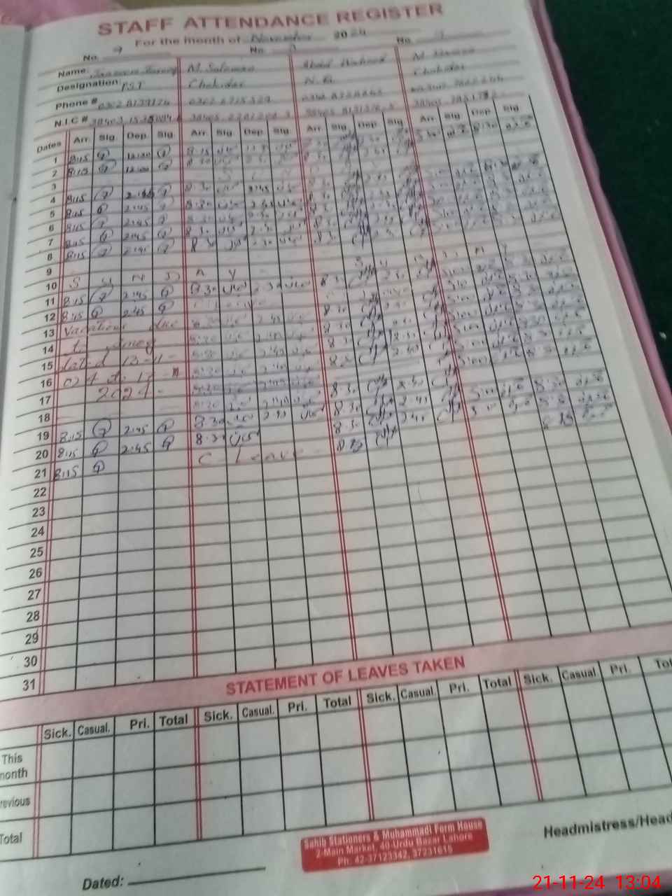 | CNIC | Full Name | Designation | R/C | Absence During Last Calender Month |