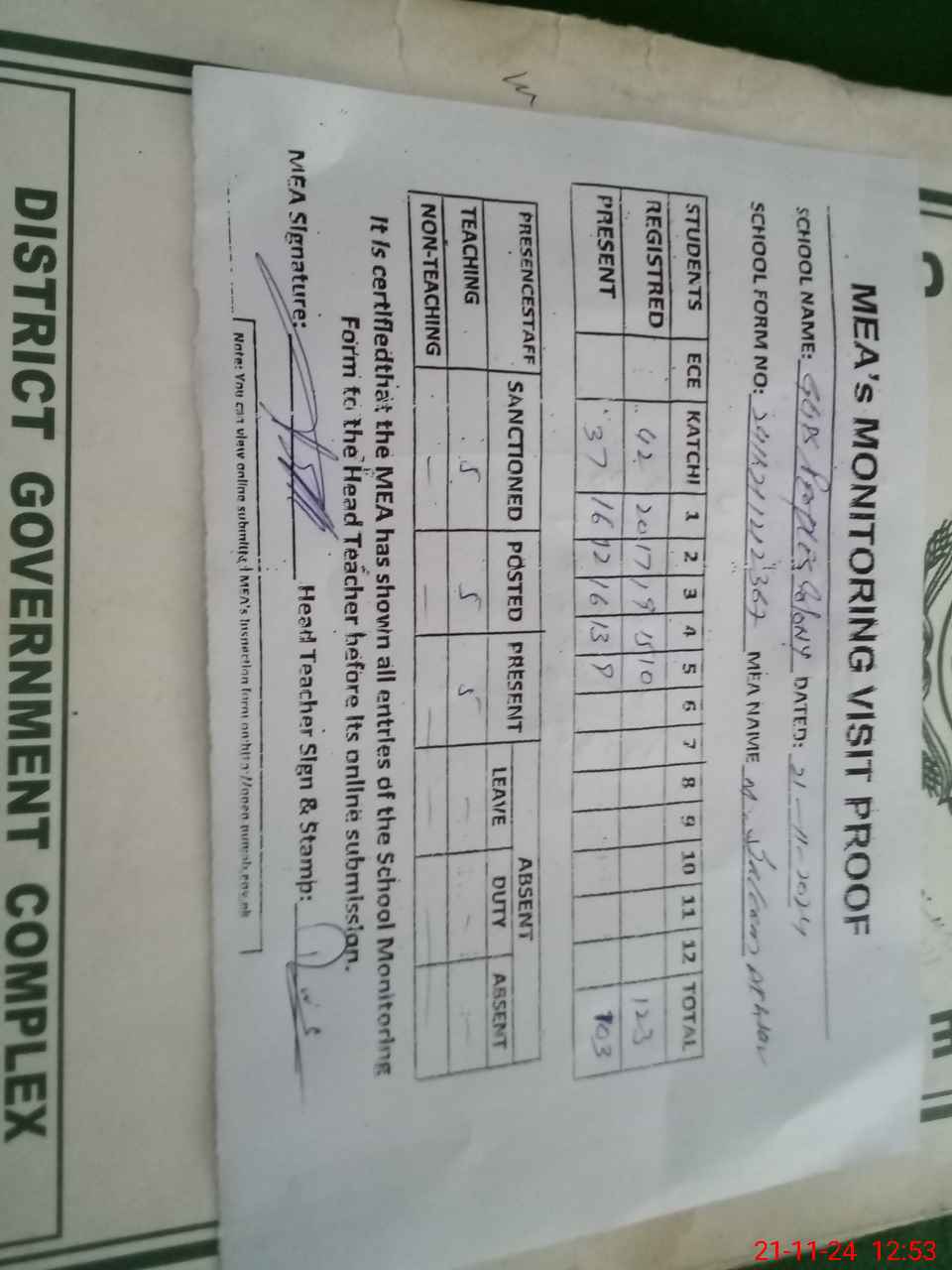 | Attendance Register | Head Teacher | MEA with School | Visit Proof |