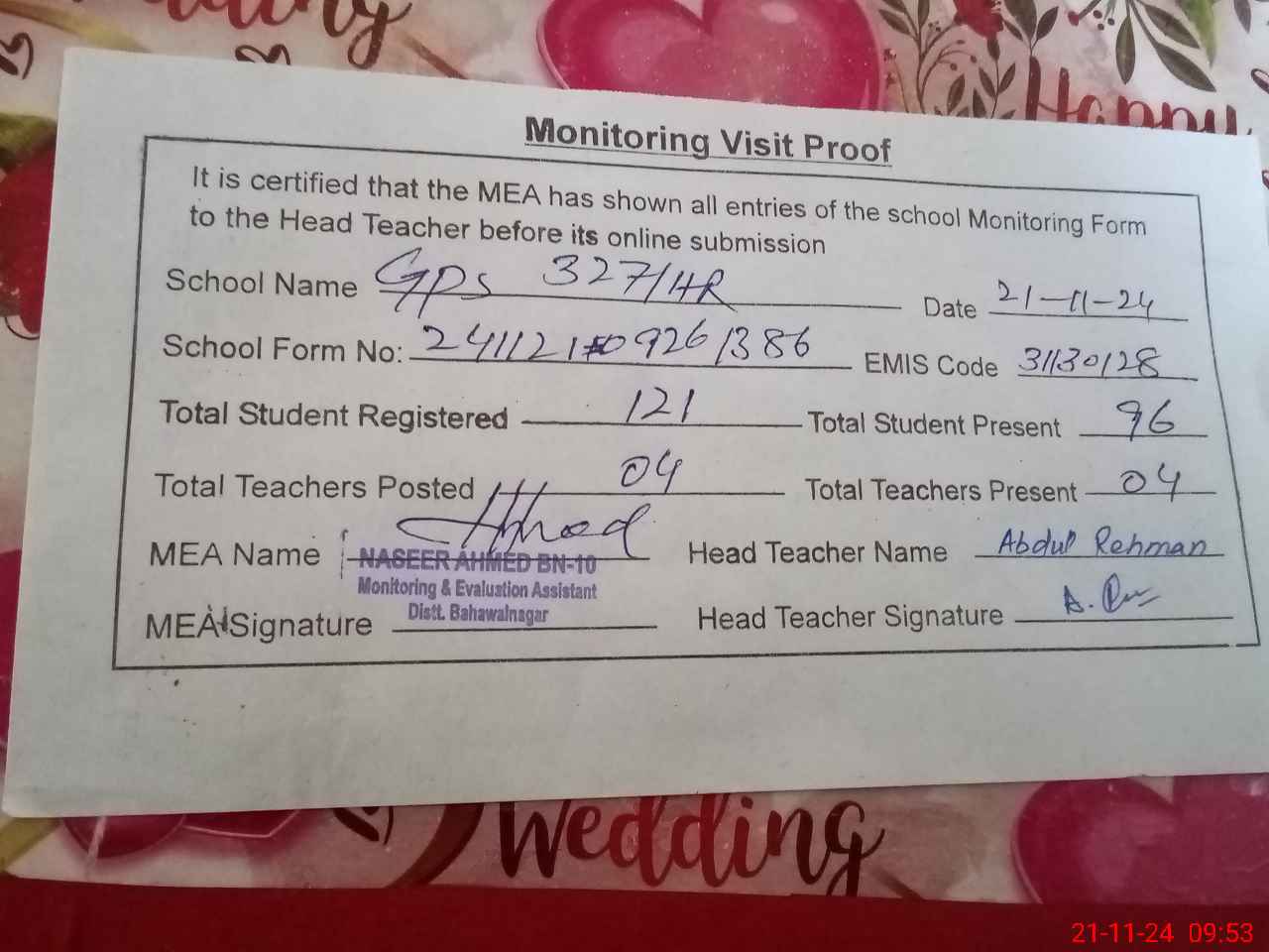| Attendance Register | Head Teacher | MEA with School | Visit Proof |