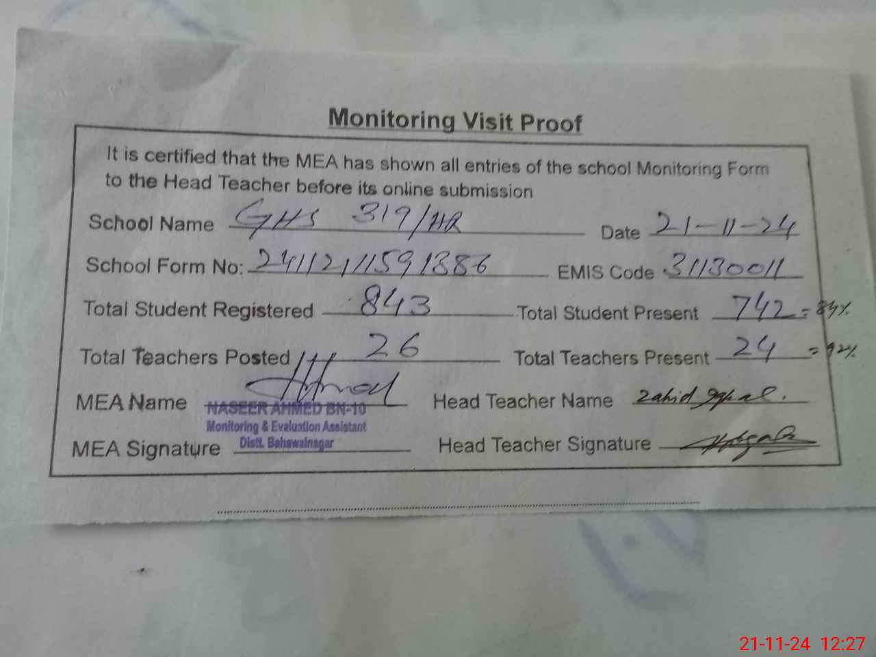 | EMIS Code: 31130011 | Name of School: GHSS CHAK 319/HR | |||