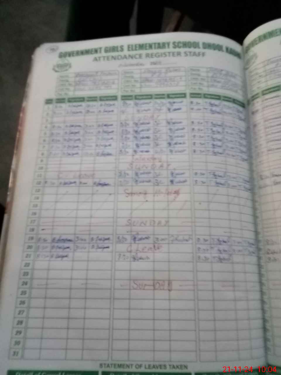 | Leave | Duty | Absent | Maternity | Medical | Ex- Pak |