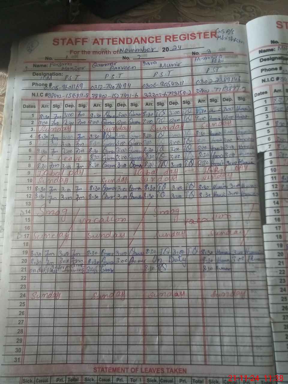 | CNIC | Full Name | Designation | R/C | Absence During Last Calender Month |