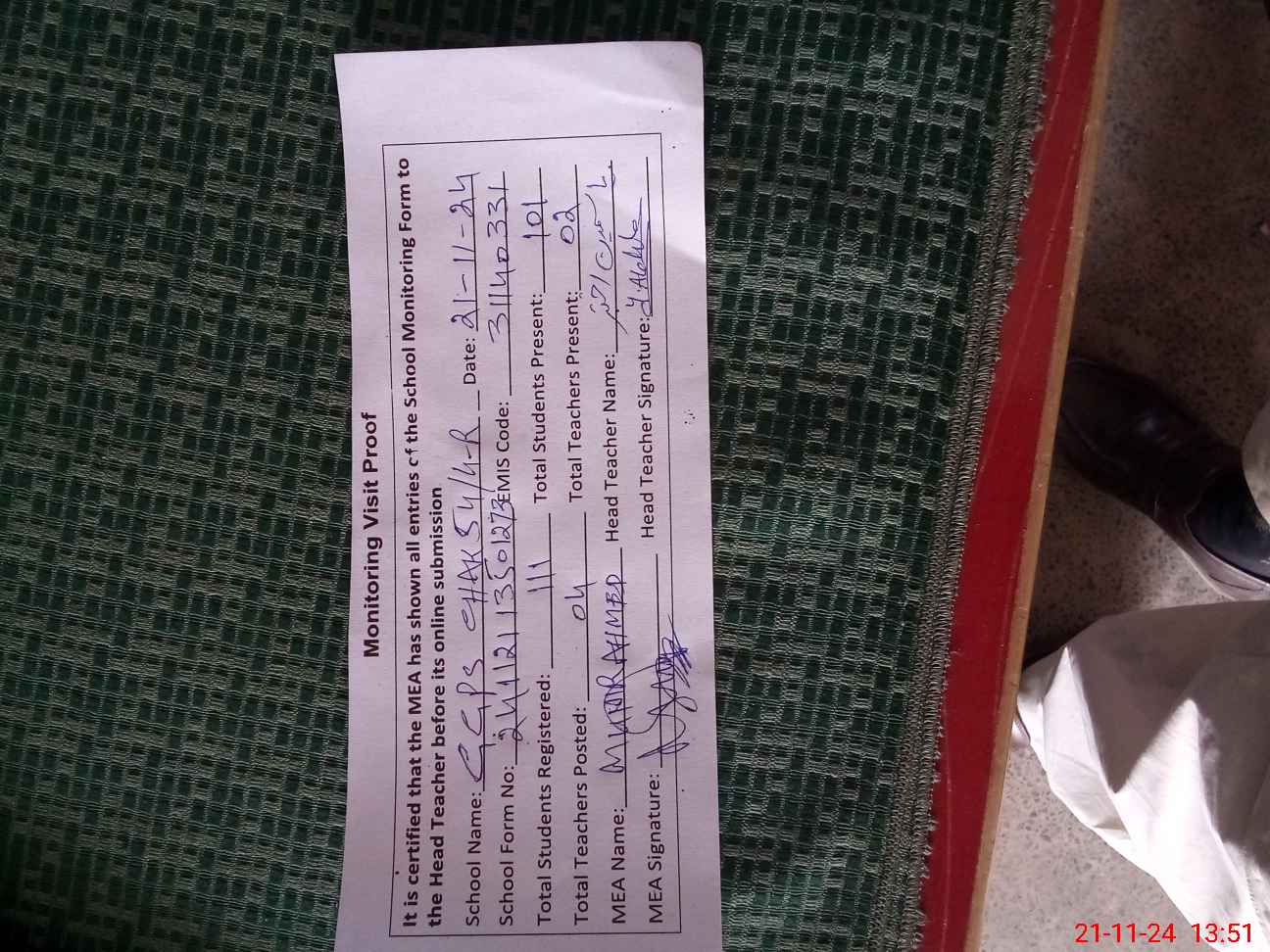| Attendance Register | Head Teacher | MEA with School | Visit Proof |