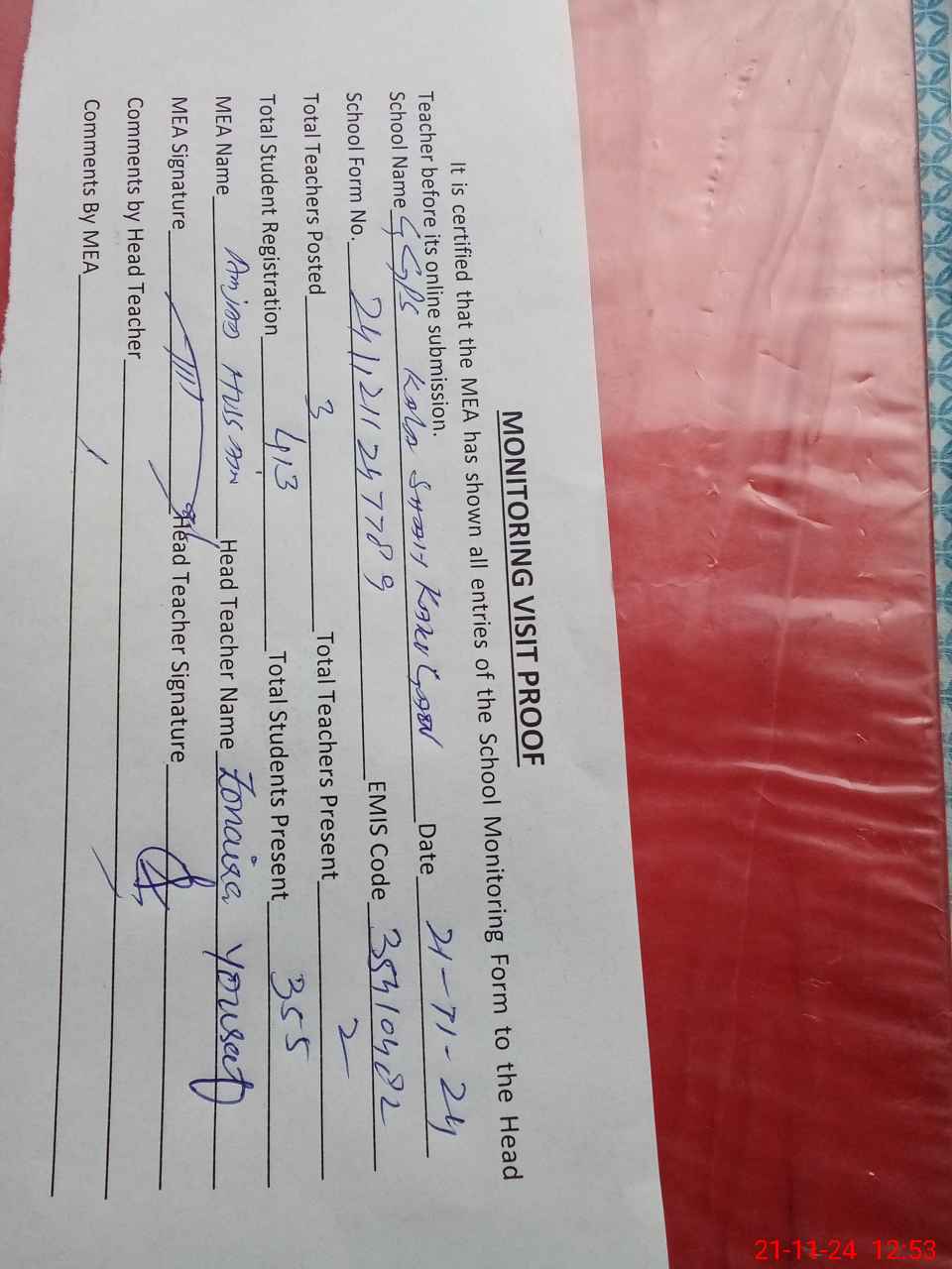 | Attendance Register | Head Teacher | MEA with School | Visit Proof |