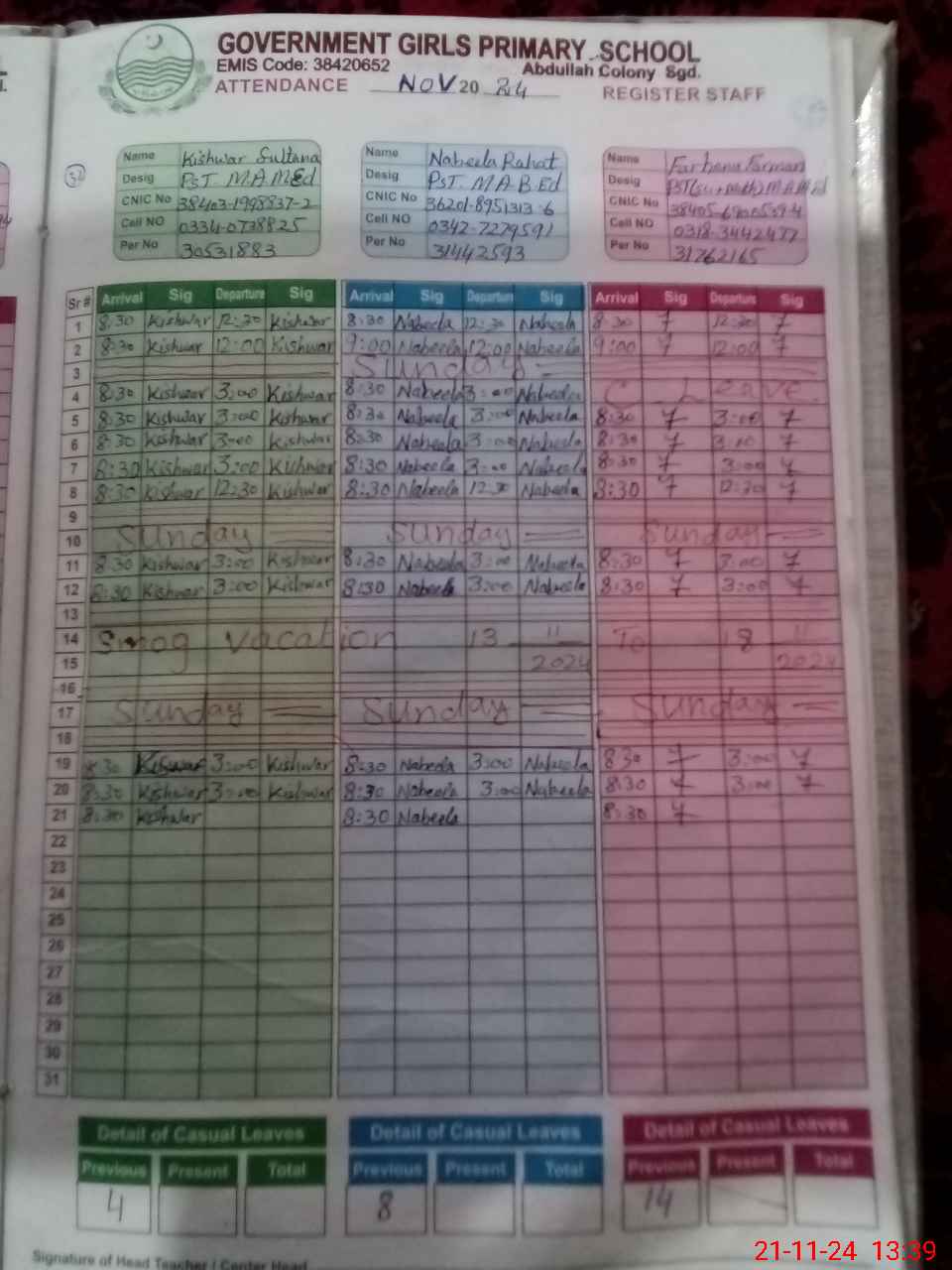 | CNIC | Full Name | Designation | R/C | Absence During Last Calender Month |