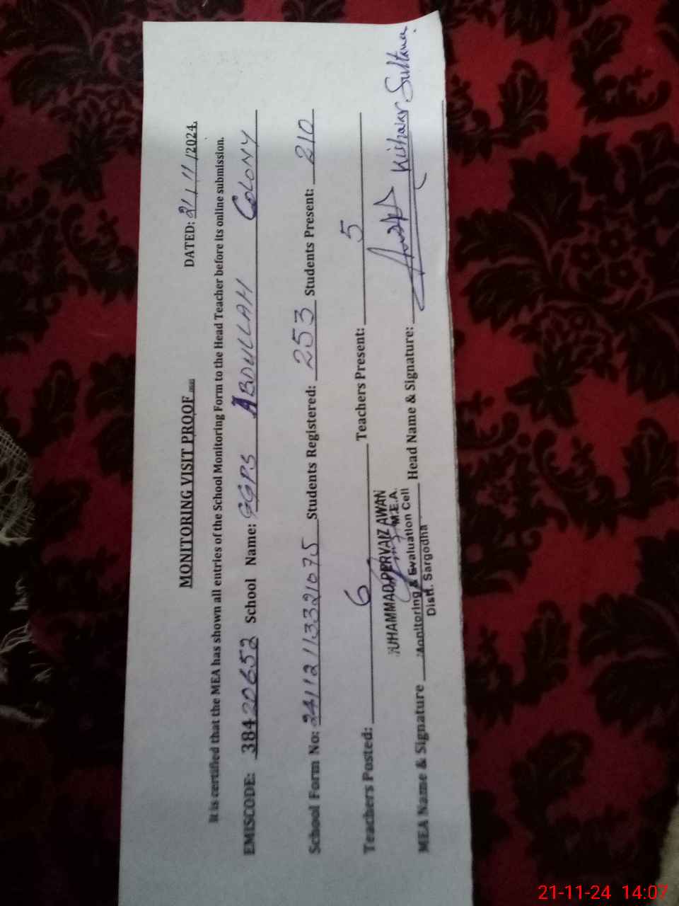 | Attendance Register | Head Teacher | MEA with School | Visit Proof |