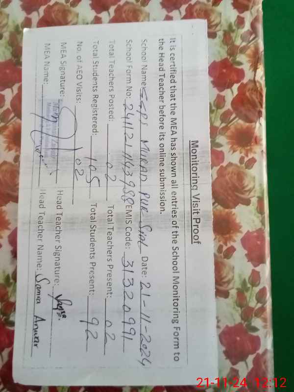 | EMIS Code: 31320991 | Name of School: GGPS MURAD PUR SIAL | |||