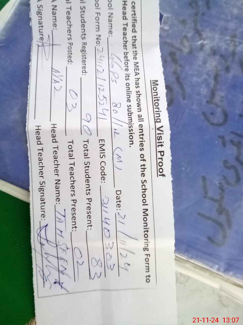 | Attendance Register | Head Teacher | MEA with School | Visit Proof |