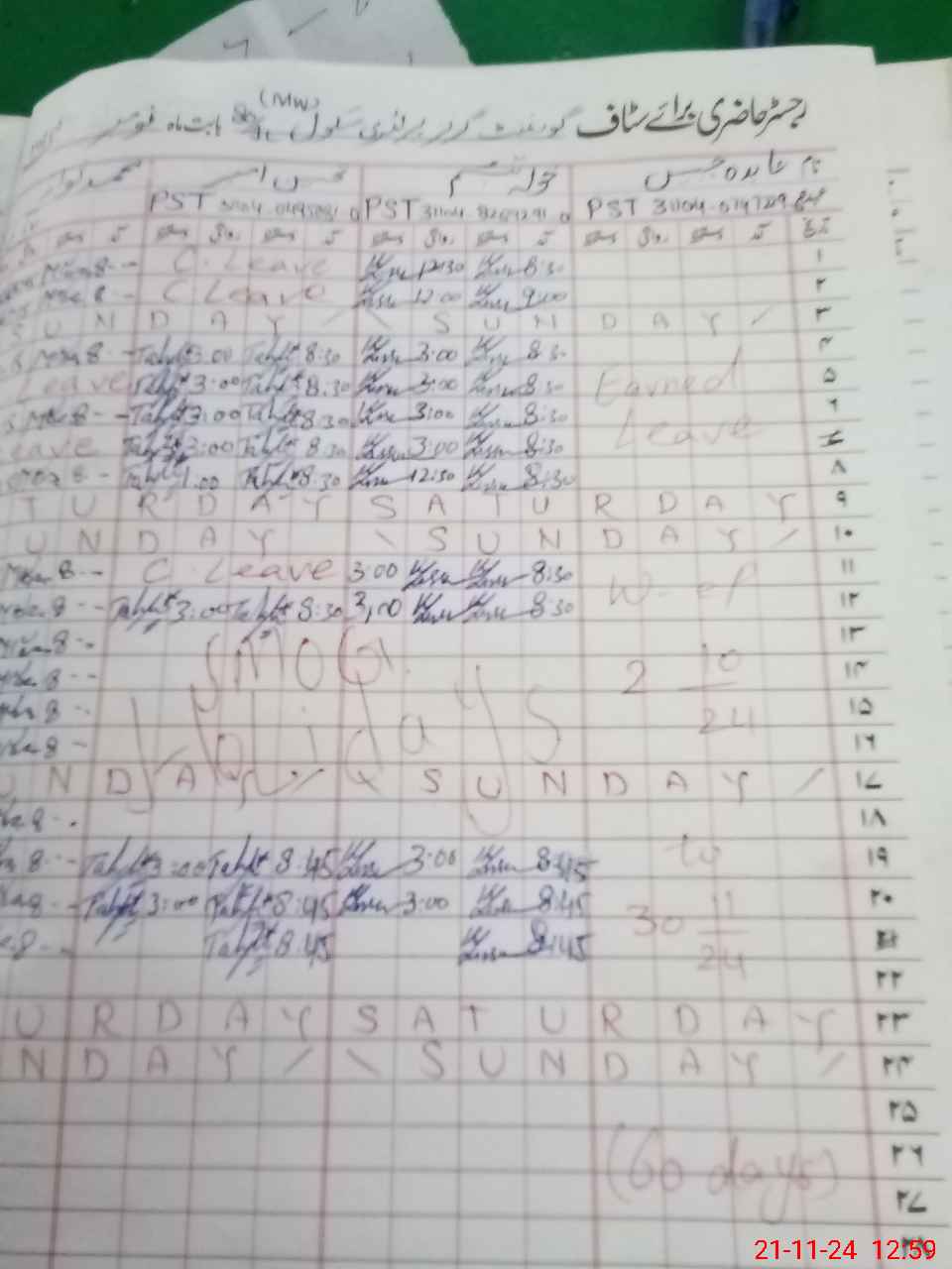 | Leave | Duty | Absent | Maternity | Medical | Ex- Pak |