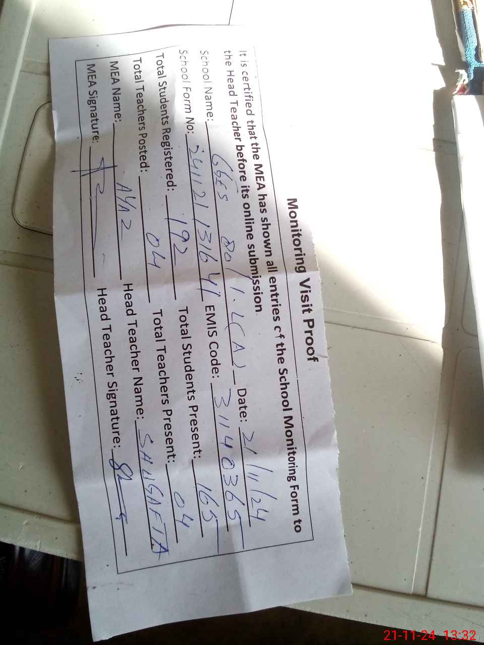 | Attendance Register | Head Teacher | MEA with School | Visit Proof |