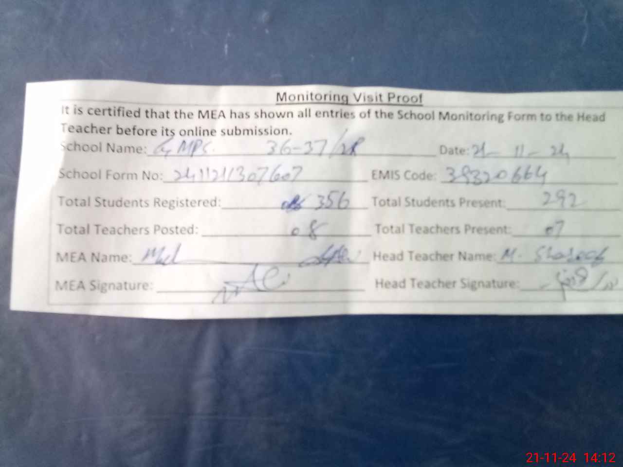 | Attendance Register | Head Teacher | MEA with School | Visit Proof |