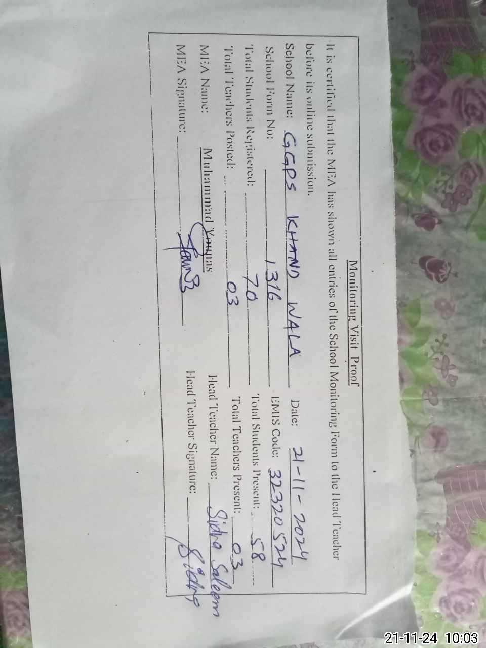 | Name: Si**** Sa**** Designation: (School Headmaster's/Headmistress's) PST Phone/Cell Number: 03**** |