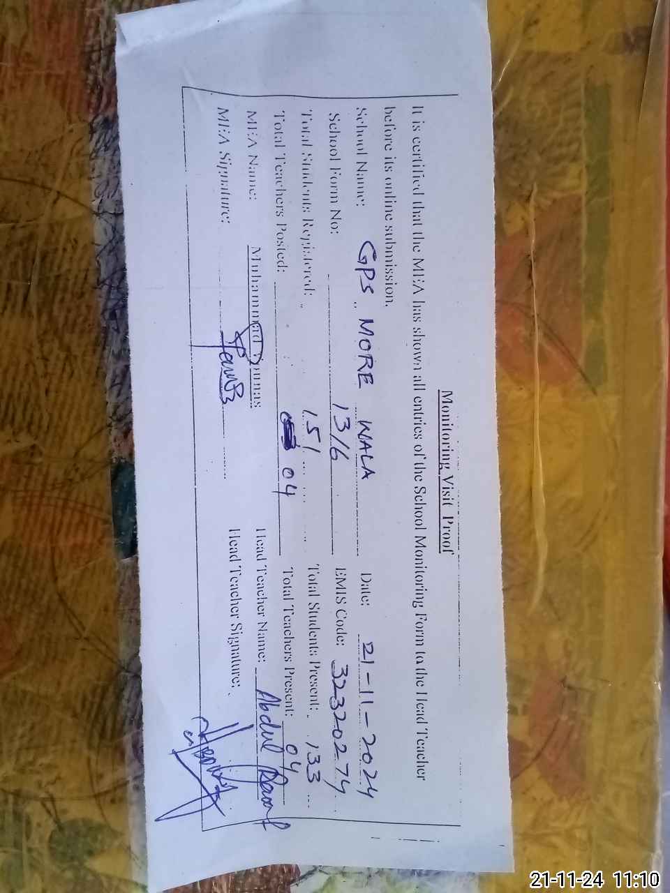 | EMIS Code: 32320274 | Name of School: GPS MORE WALA | |||