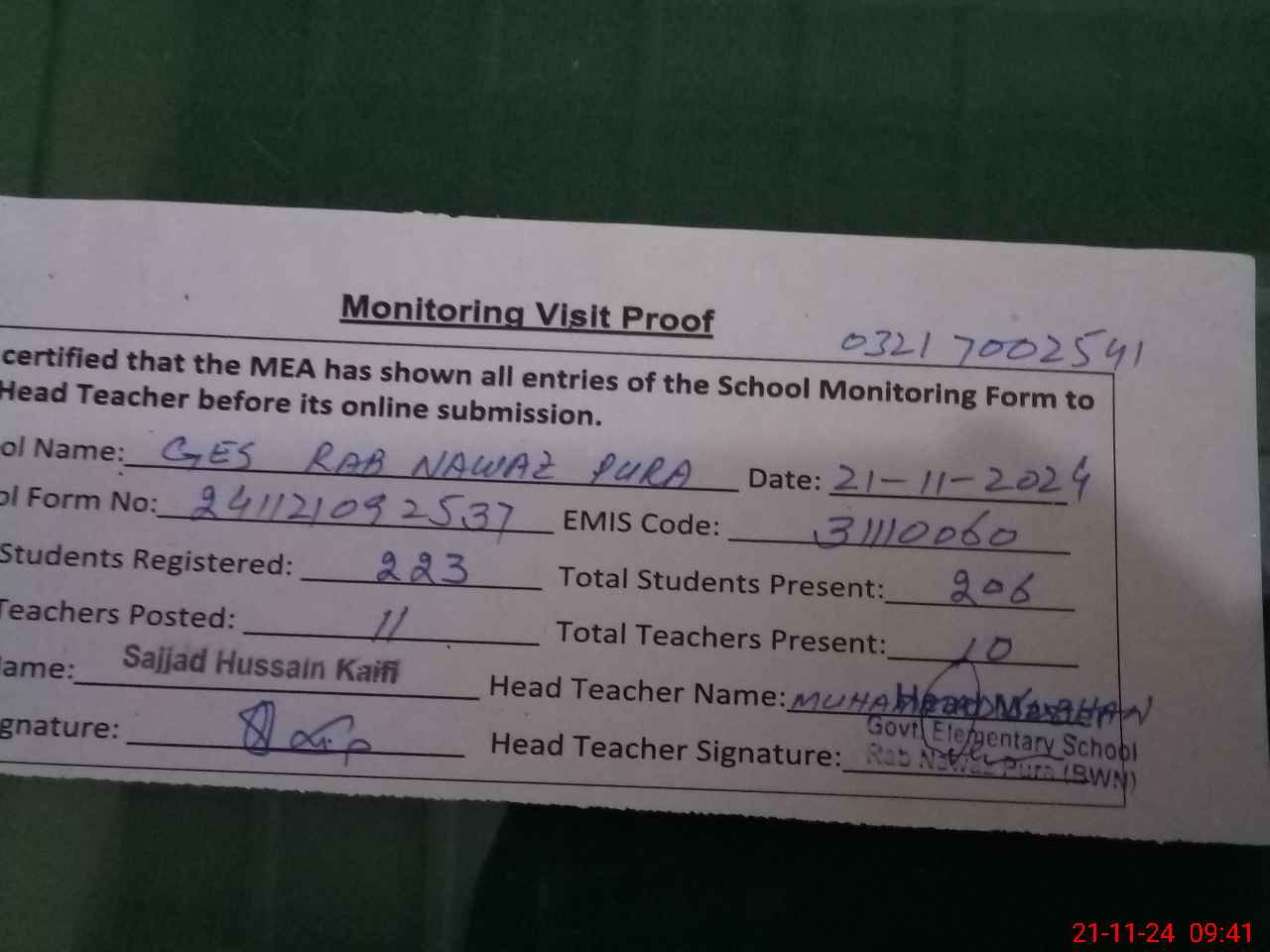 | Name: MHa**** Ba**** Designation: (School Headmaster's/Headmistress's) E S T Phone/Cell Number: 03**** |