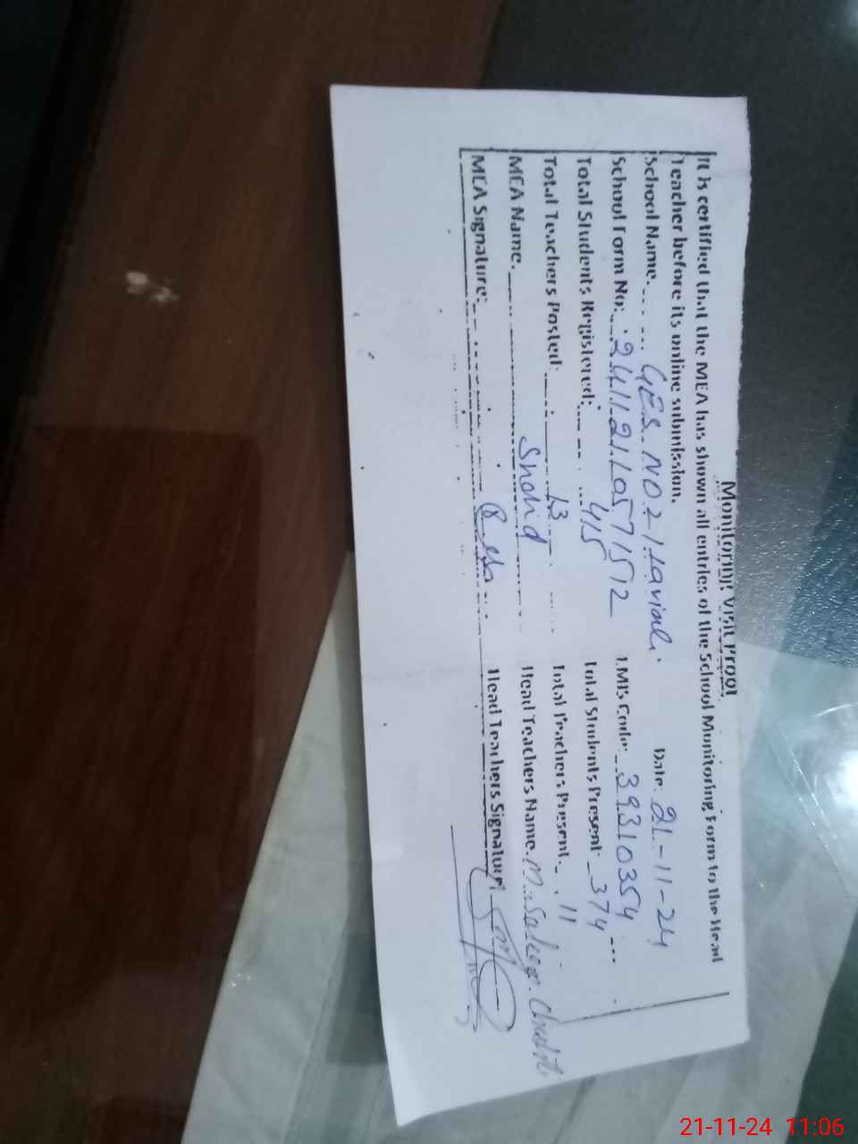 | Monitoring Date: 21-11-2024 | Start Time: 21-11-2024 10:57 AM | End Time: 21-11-2024 11:06 AM | Name of MEA: SH**** YO**** | |