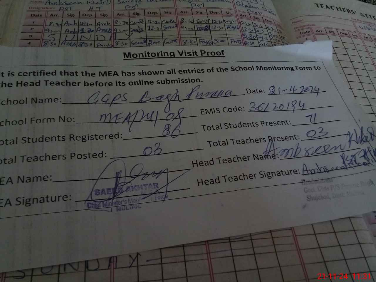 | Attendance Register | Head Teacher | MEA with School | Visit Proof |