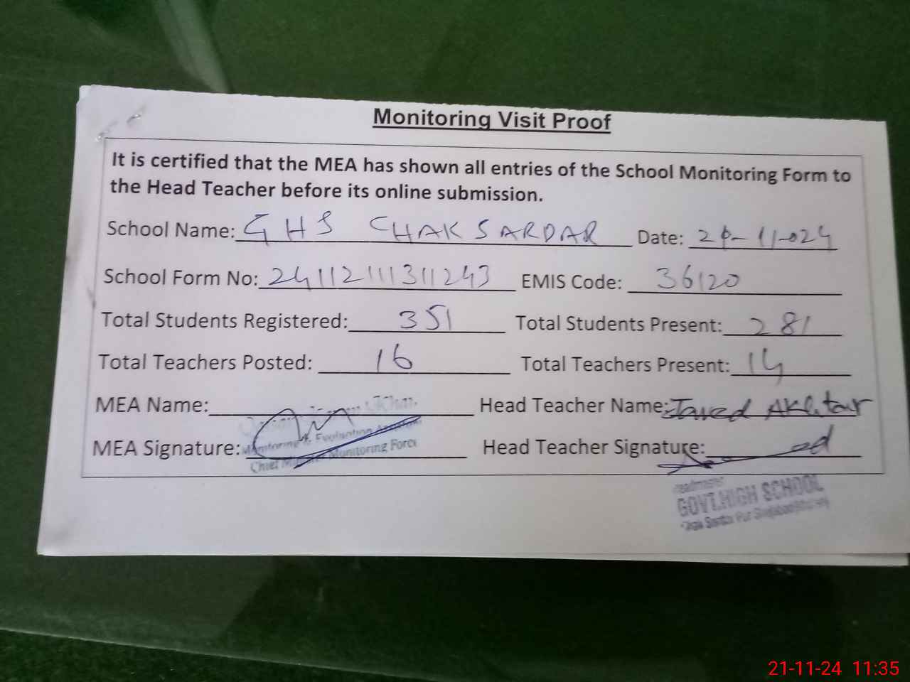 | Attendance Register | Head Teacher | MEA with School | Visit Proof |