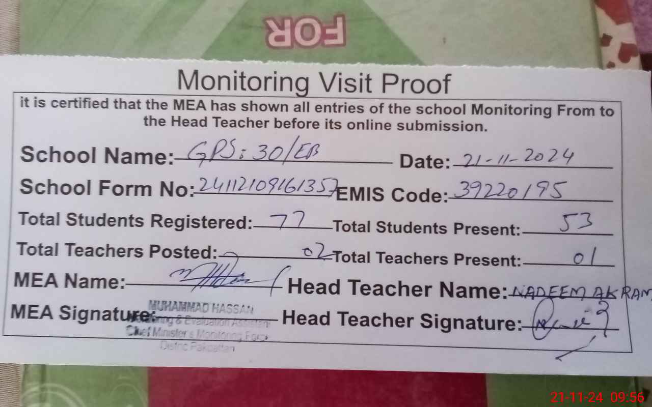 | School Visited by School Health & Nutrition Supervisor (No. of Visits) | 1 | Name1: | HAFIZ TOUQEER MANZOOR | Name2: | Nil |