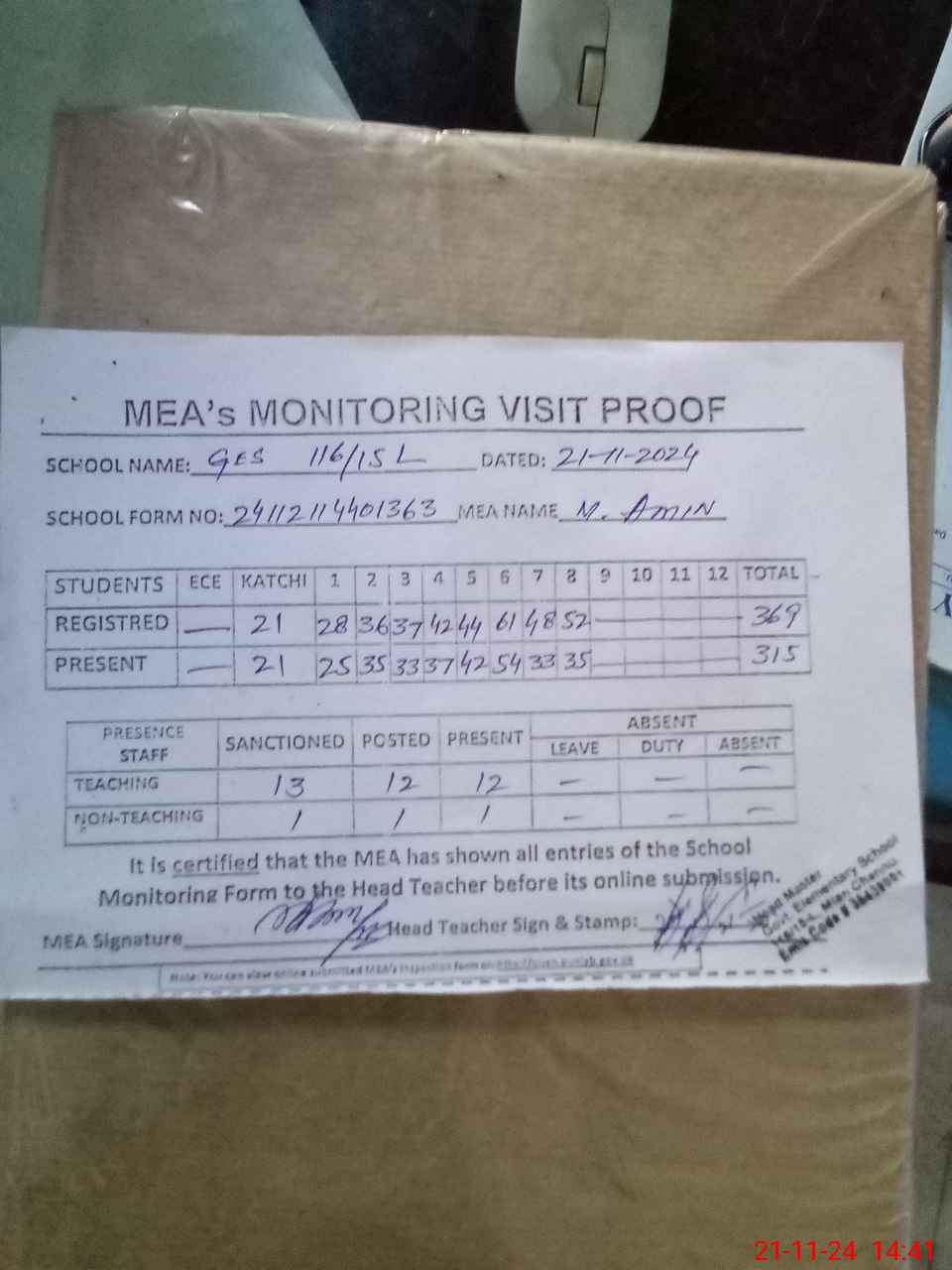 | EMIS Code: 36430051 | Name of School: GES 116/15-L, MIAN CHANNU | |||