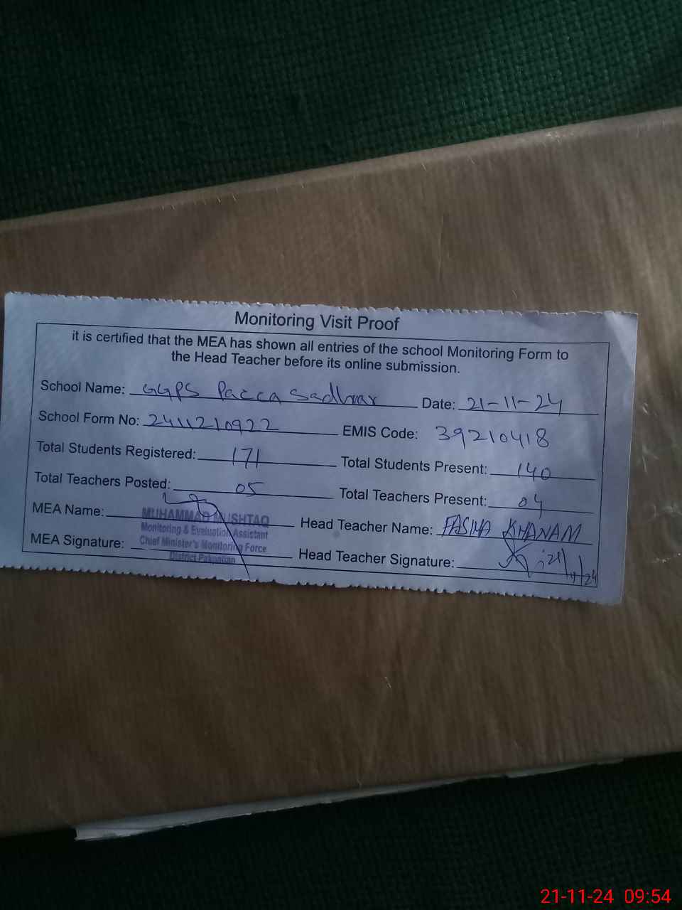 | Attendance Register | Head Teacher | MEA with School | Visit Proof |