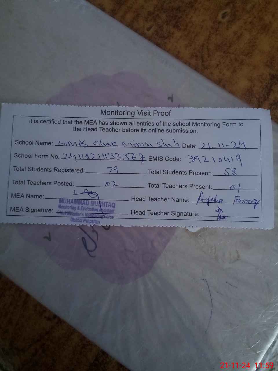 | EMIS Code: 39210419 | Name of School: GMPS CHAK MIRAN SHAH | |||