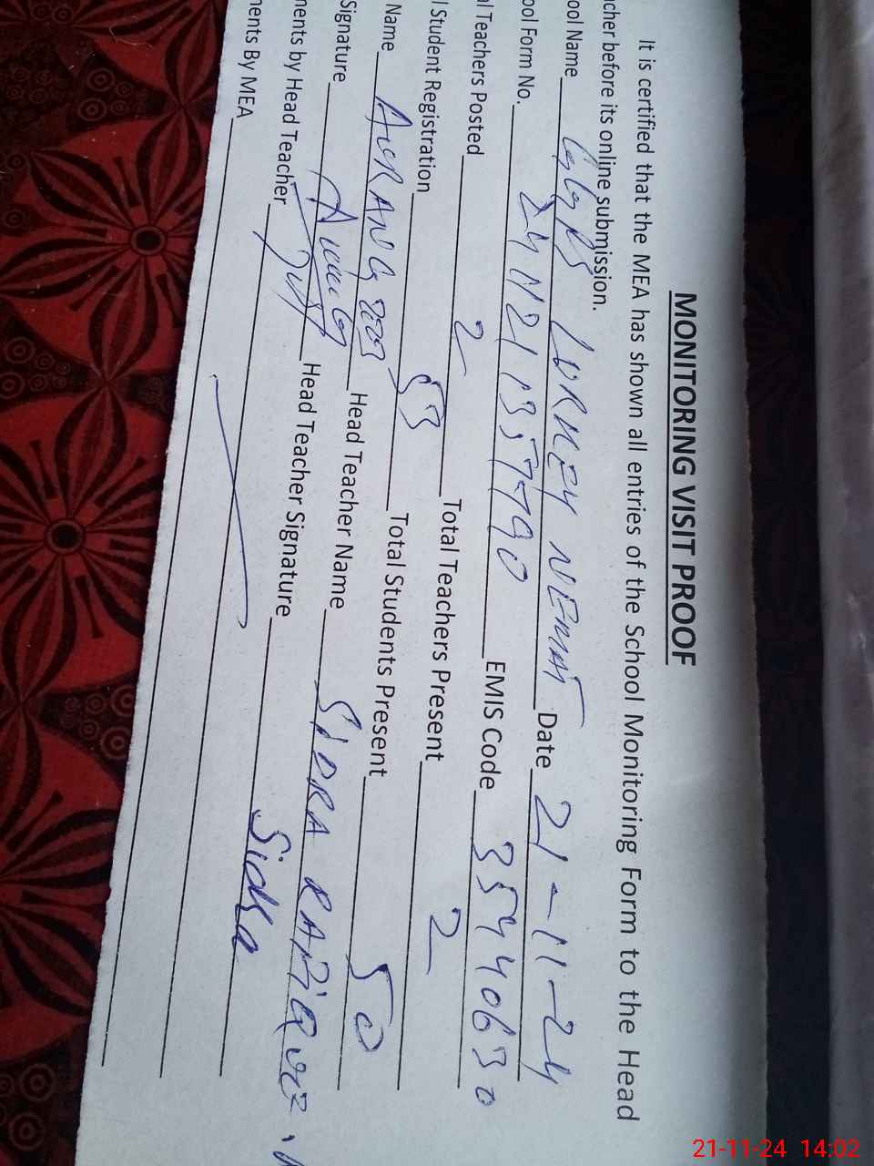 | Attendance Register | Head Teacher | MEA with School | Visit Proof |