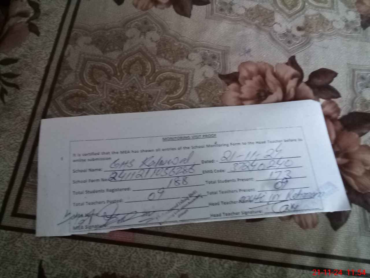 | Attendance Register | Head Teacher | MEA with School | Visit Proof |