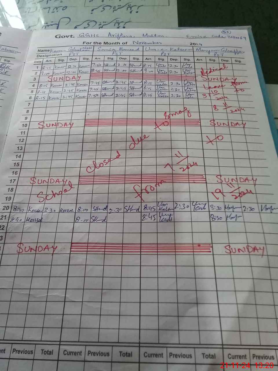 | CNIC | Full Name | Designation | R/C | Absence During Last Calender Month |