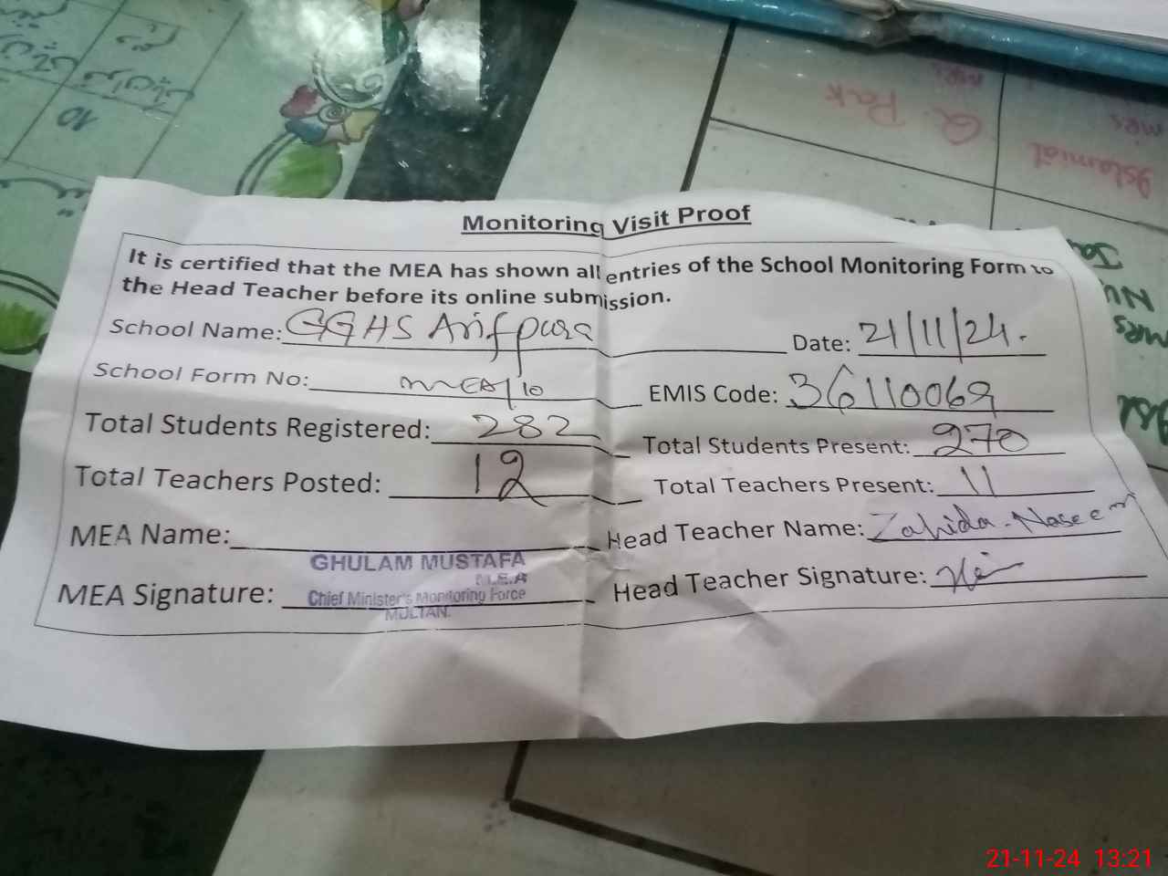 | EMIS Code: 36110069 | Name of School: GGHS ARIF PURA MULTAN | |||