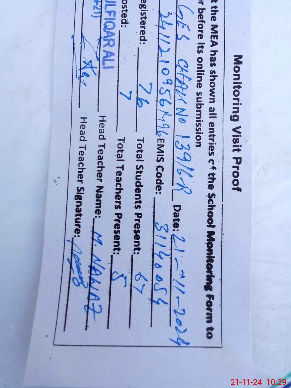 | Attendance Register | Head Teacher | MEA with School | Visit Proof |