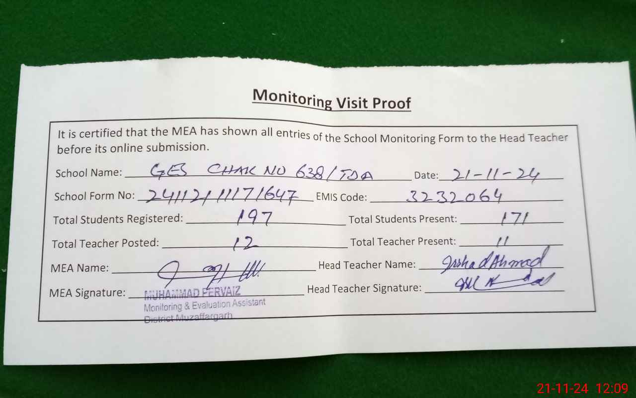 | EMIS Code: 32320064 | Name of School: GES CHAK NO. 638/TDA | |||