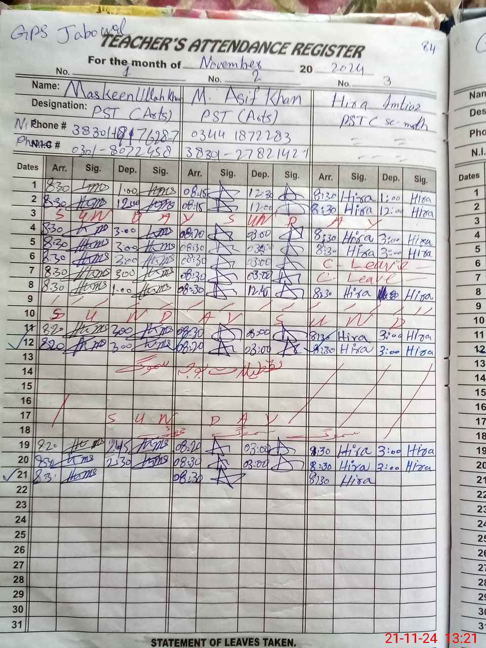 | CNIC | Full Name | Designation | R/C | Absence During Last Calender Month |