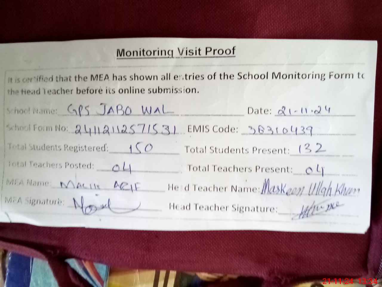| Attendance Register | Head Teacher | MEA with School | Visit Proof |