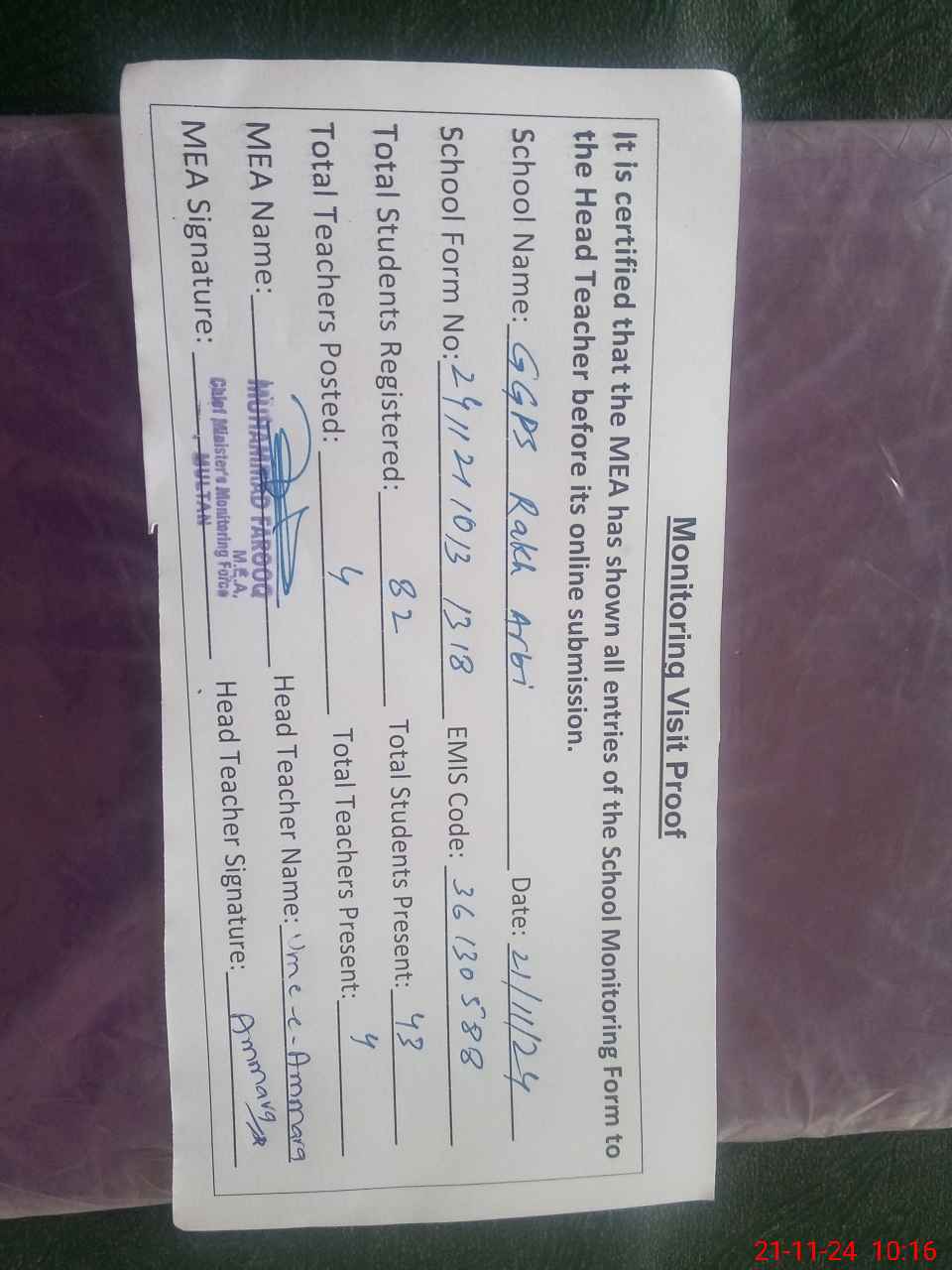 | Attendance Register | Head Teacher | MEA with School | Visit Proof |