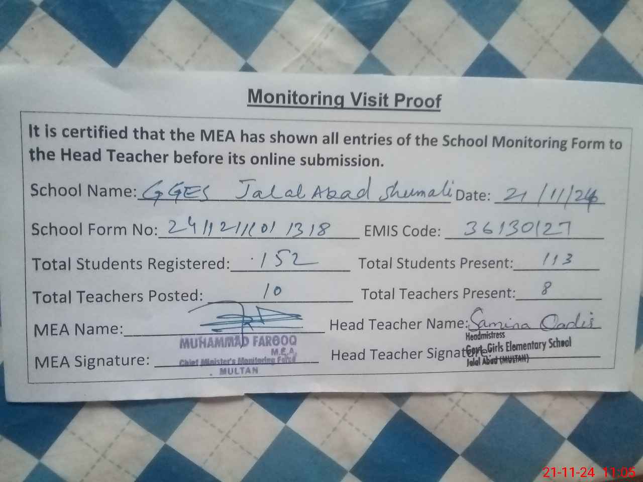 | Attendance Register | Head Teacher | MEA with School | Visit Proof |