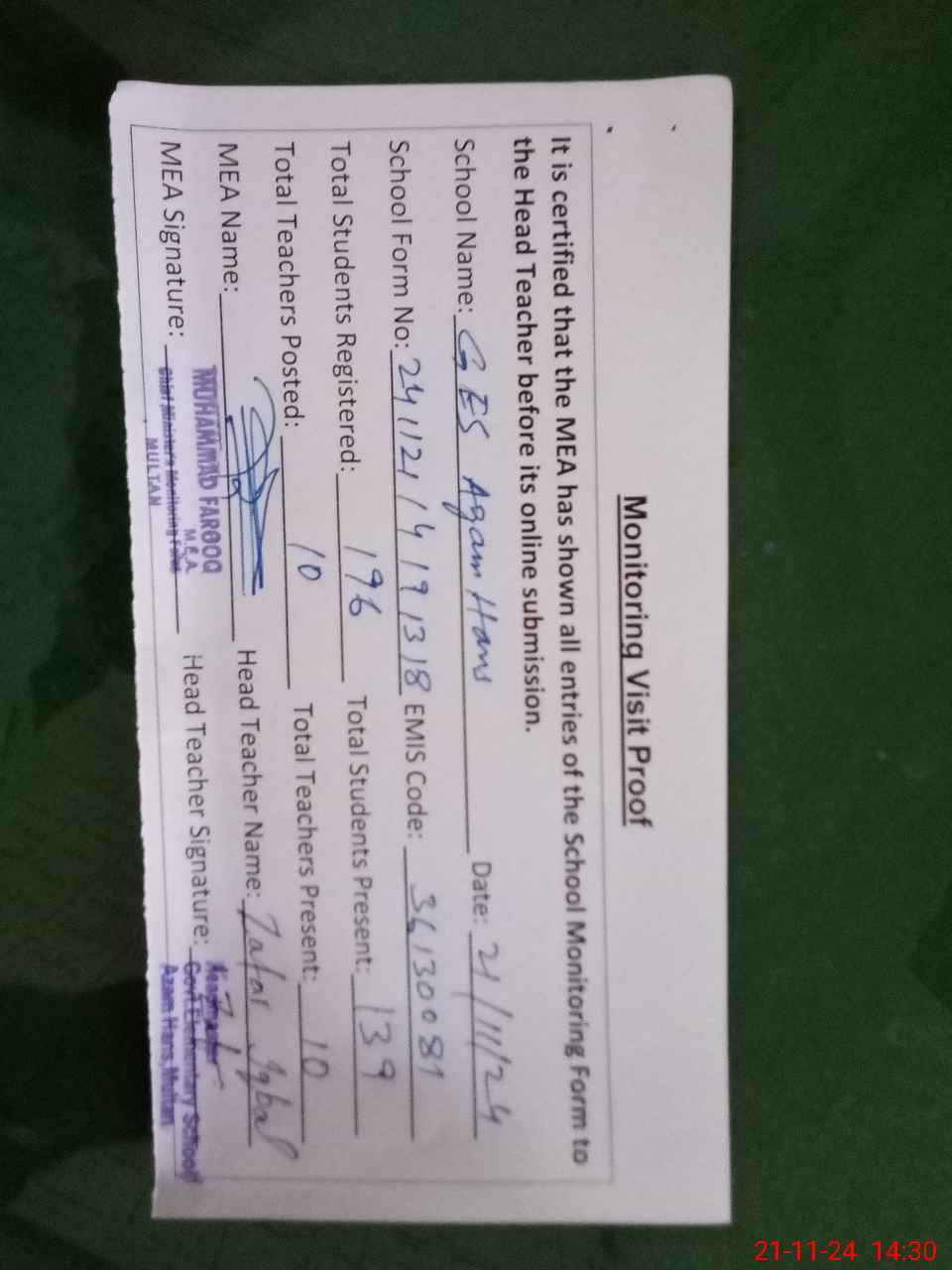 | Attendance Register | Head Teacher | MEA with School | Visit Proof |