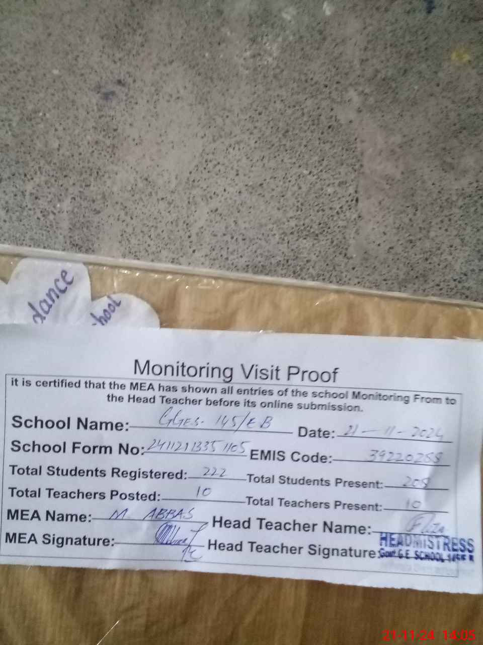 | Attendance Register | Head Teacher | MEA with School | Visit Proof |