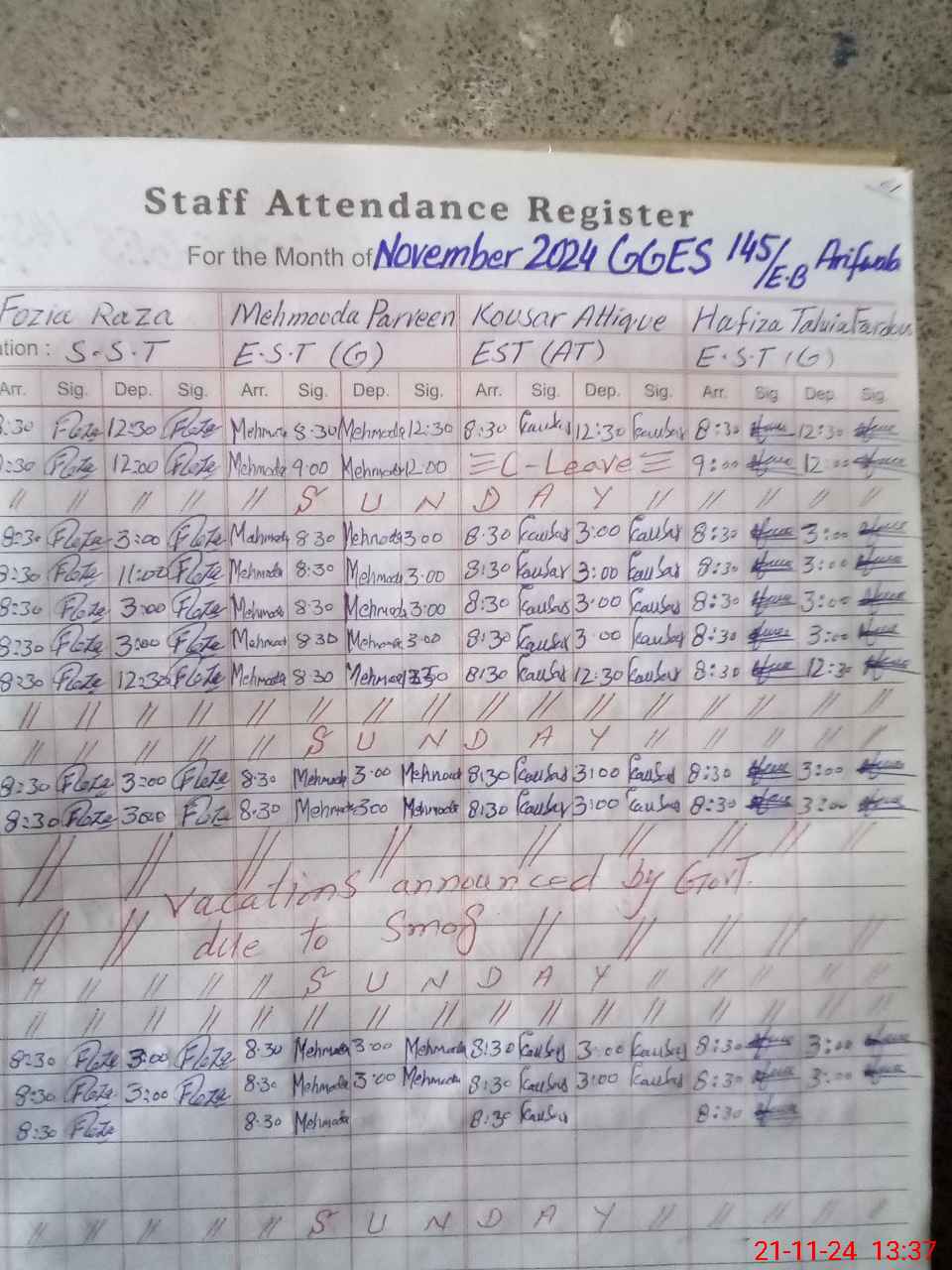 | Monitoring Date: 21-11-2024 | Start Time: 21-11-2024 01:35 PM | End Time: 21-11-2024 02:06 PM | Name of MEA: Mu**** Ab**** | |