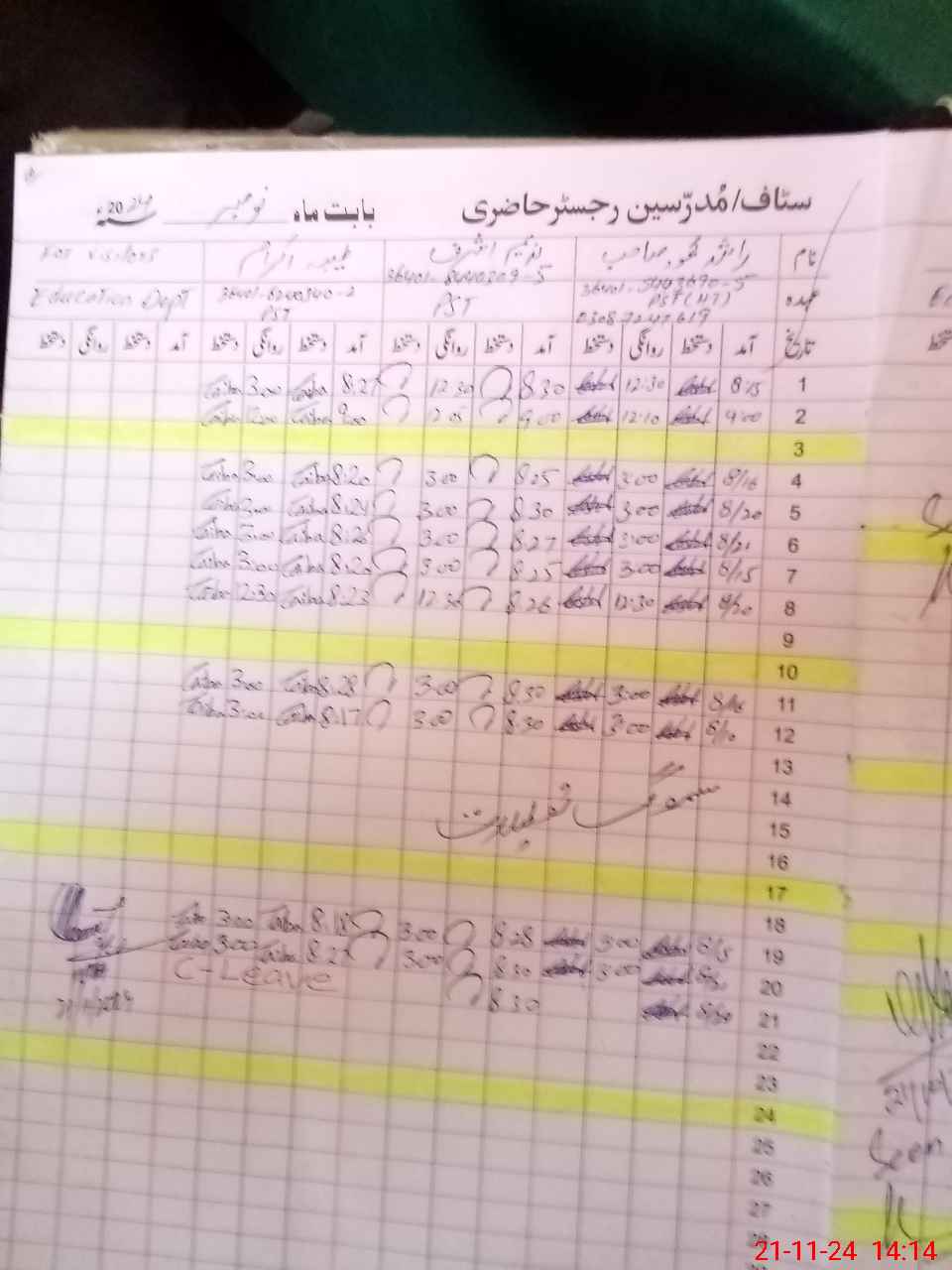 | CNIC | Full Name | Designation | R/C | Absence During Last Calender Month |