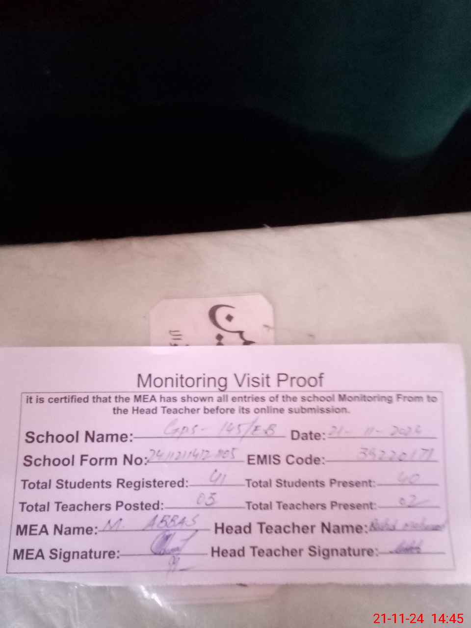 | Attendance Register | Head Teacher | MEA with School | Visit Proof |