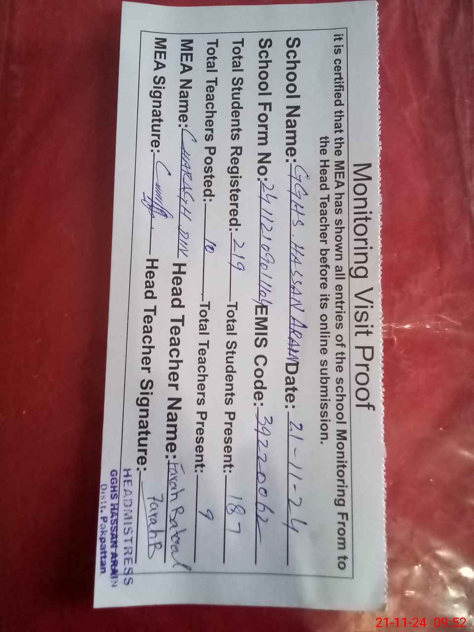 | EMIS Code: 39220062 | Name of School: GGHS HASSAN ARAIN | |||