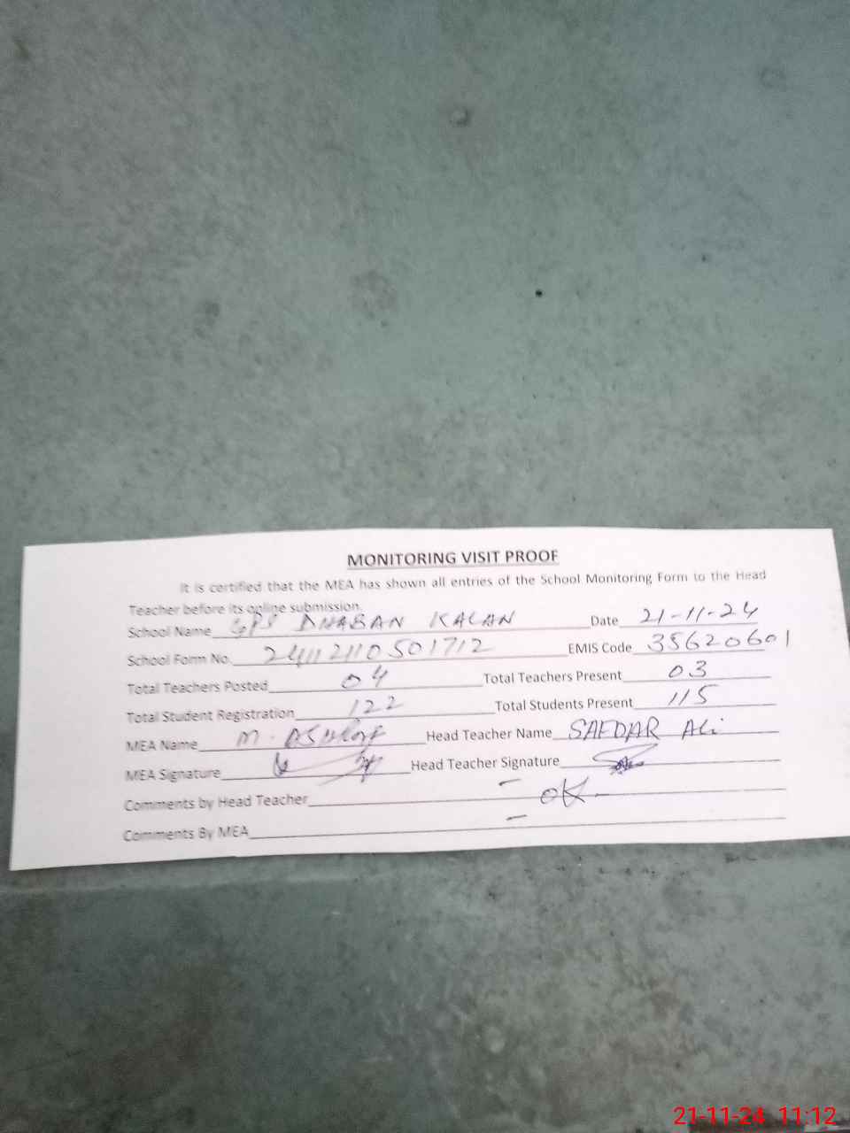 | Attendance Register | Head Teacher | MEA with School | Visit Proof |