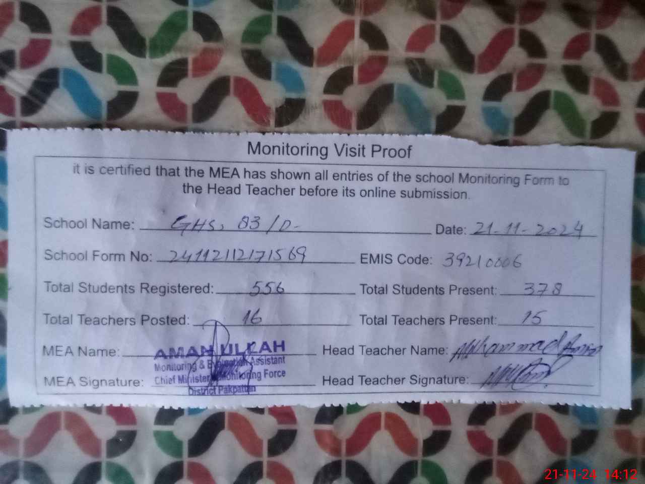 | EMIS Code: 39210006 | Name of School: GHS 83/D P.O 83/D PAKPATTAN | |||