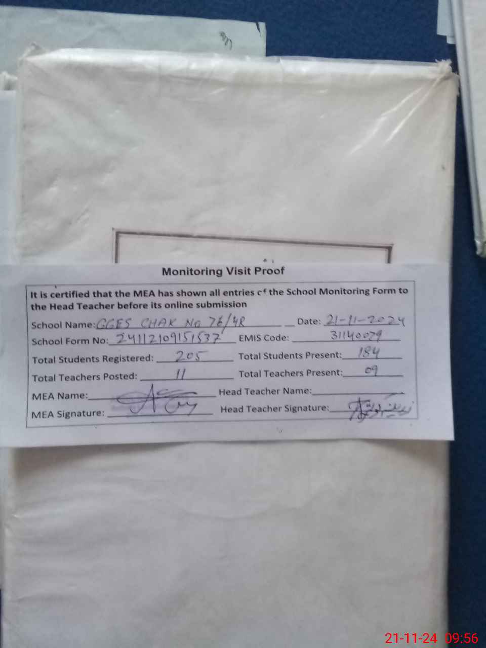 | Attendance Register | Head Teacher | MEA with School | Visit Proof |