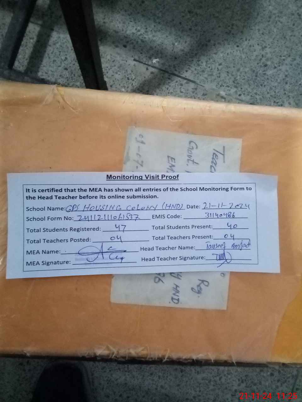 | Attendance Register | Head Teacher | MEA with School | Visit Proof |