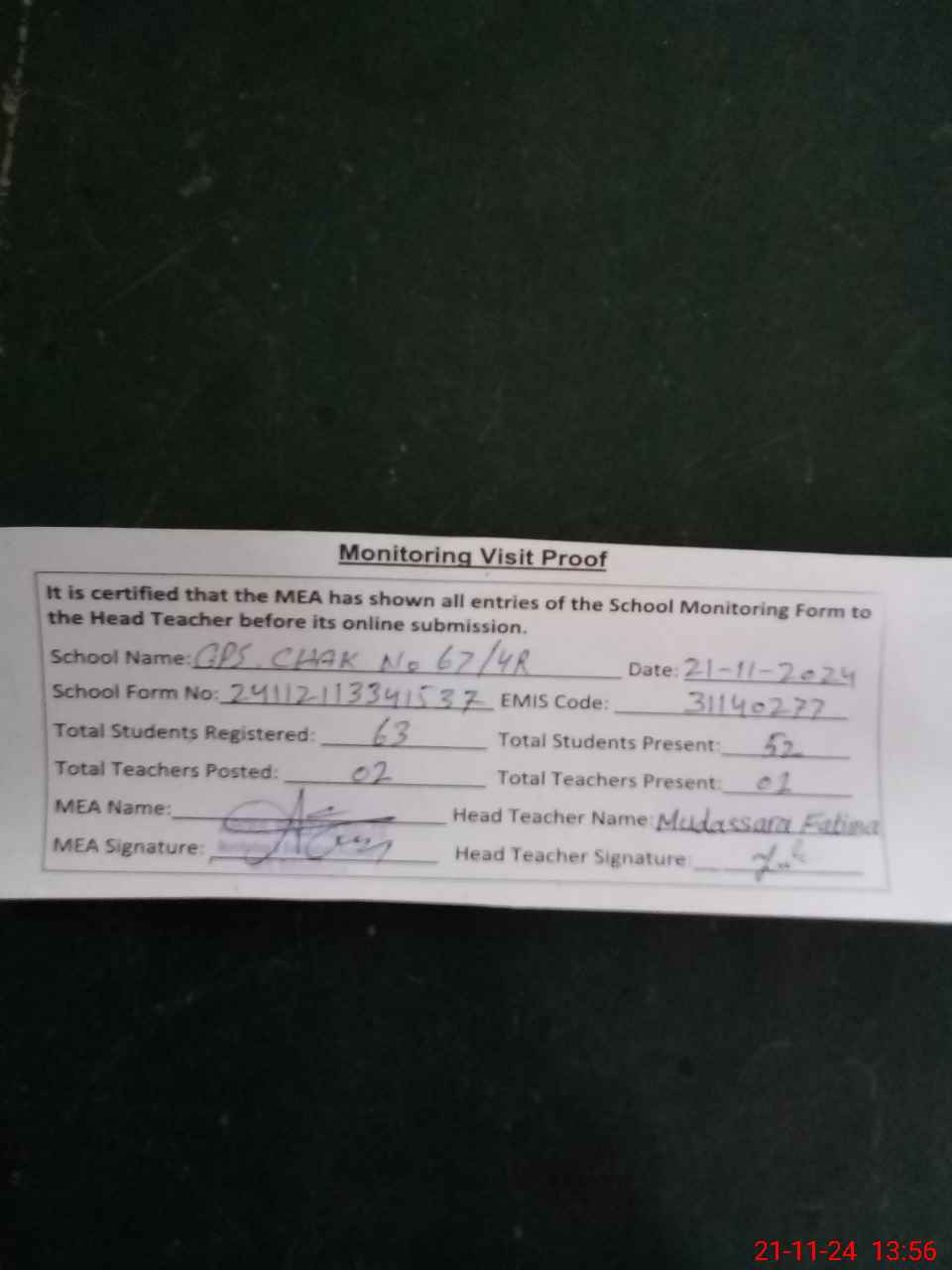 | Attendance Register | Head Teacher | MEA with School | Visit Proof |