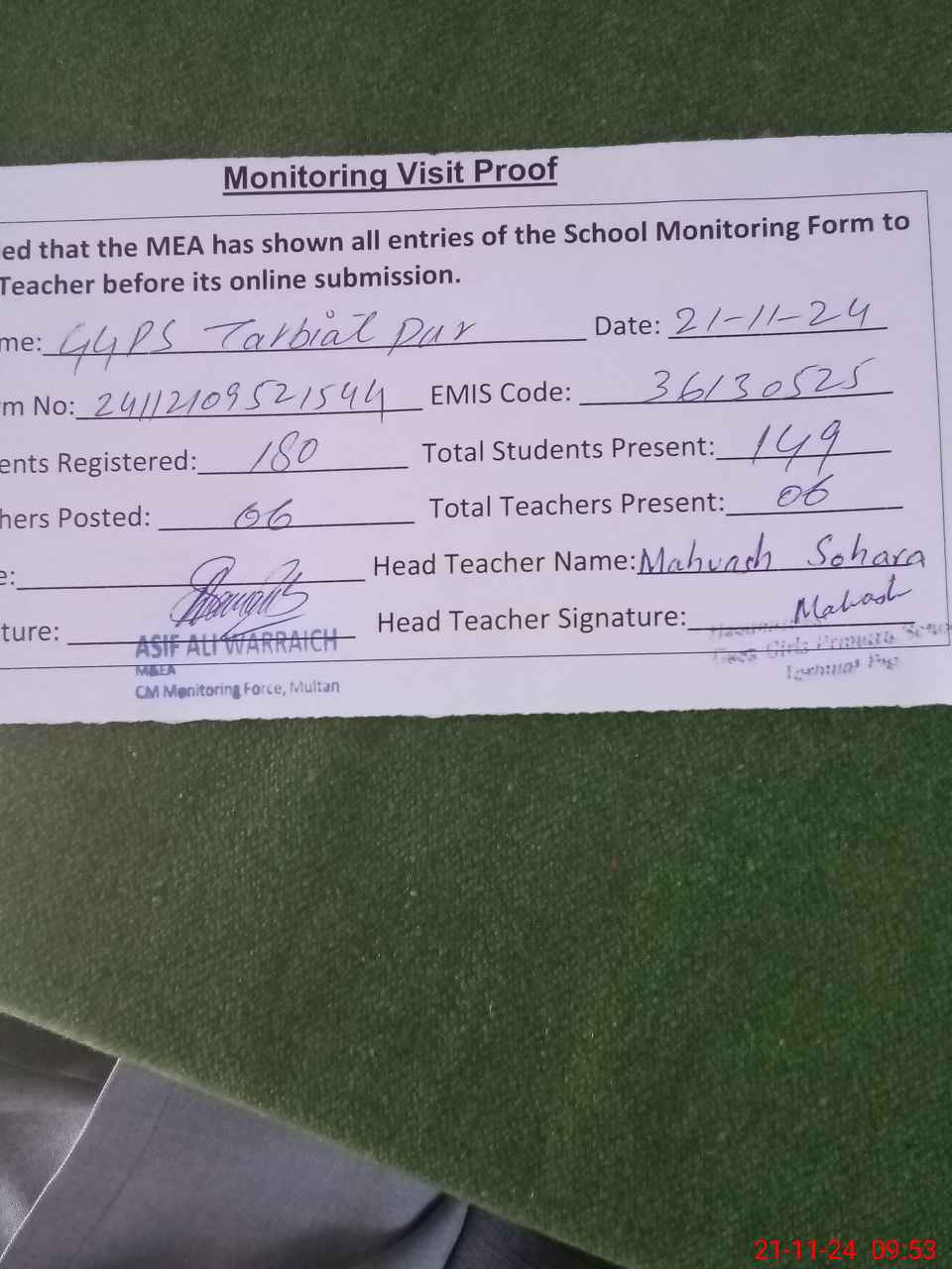 | Attendance Register | Head Teacher | MEA with School | Visit Proof |